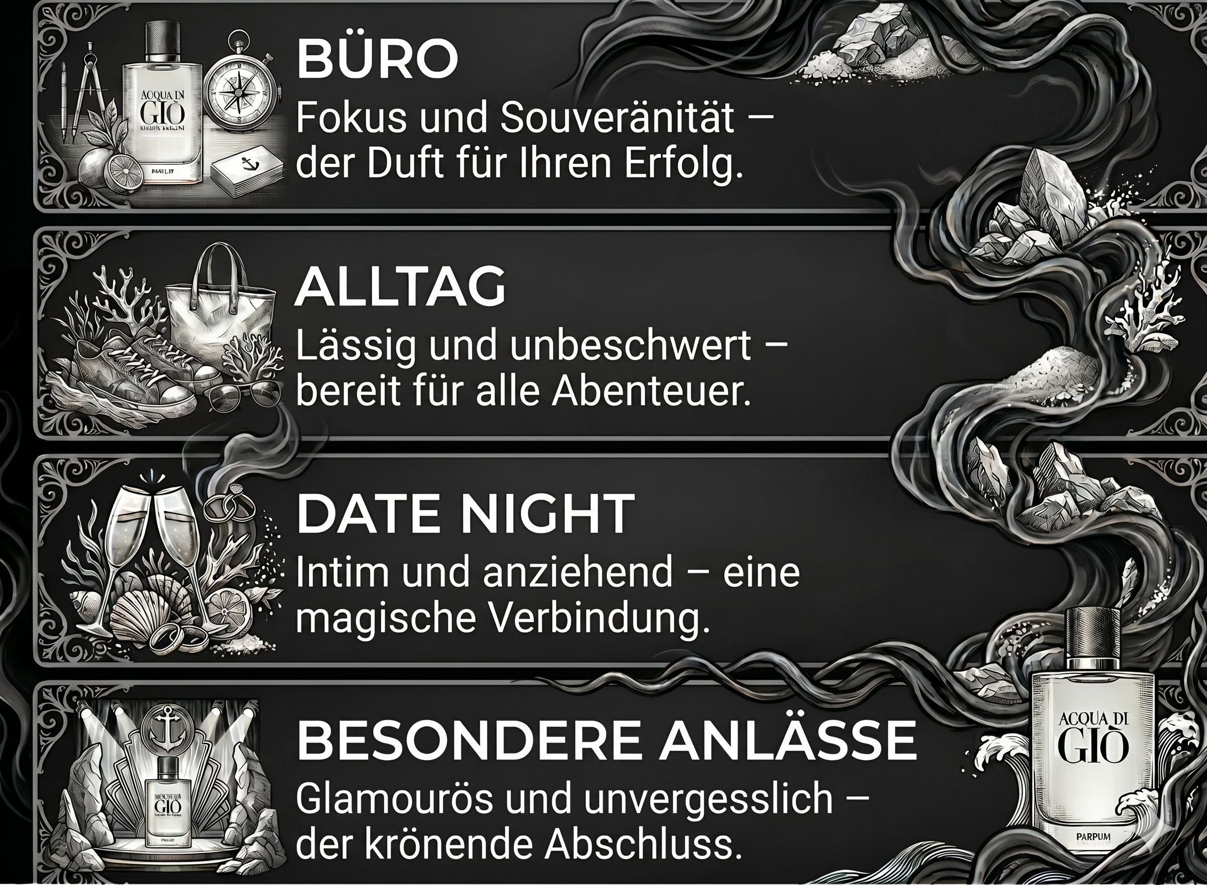 Acqua di Gio Parfum ist moderne Frische mit Tiefe für dein Game. Scent Bros bringt dir den Duft für alle, die clean auftreten, aber Eindruck hinterlassen wollen: eine kraftvolle Mischung aus maritimen Noten, aromatischem Salbei und einer warmen, mineralischen Basis. Frisch, elegant und gleichzeitig intensiv – wer Acqua di Gio Parfum trägt, wirkt souverän und präsent, ohne aufdringlich zu sein.